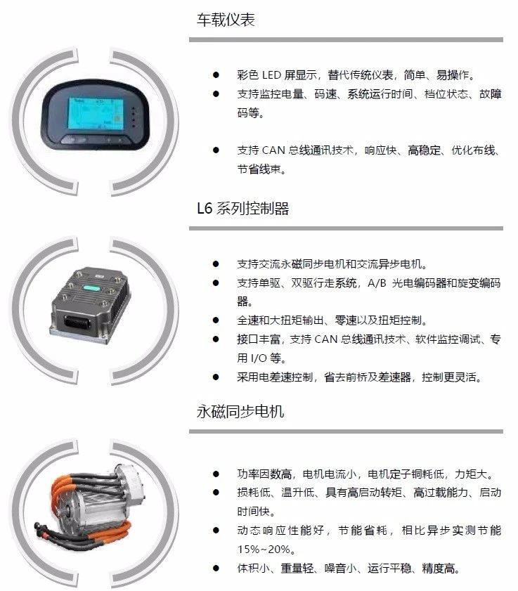 L6系列控制器适用于各类电动车辆,包括0.6T~10T各类电动平衡重叉车、2~10T电动牵引车、物流仓储车、电动剪式升降平台、高尔夫球车、电动观光车、电动环卫车、电动割草车、各类电动巡逻车、老人电动代步车等低速电动车。